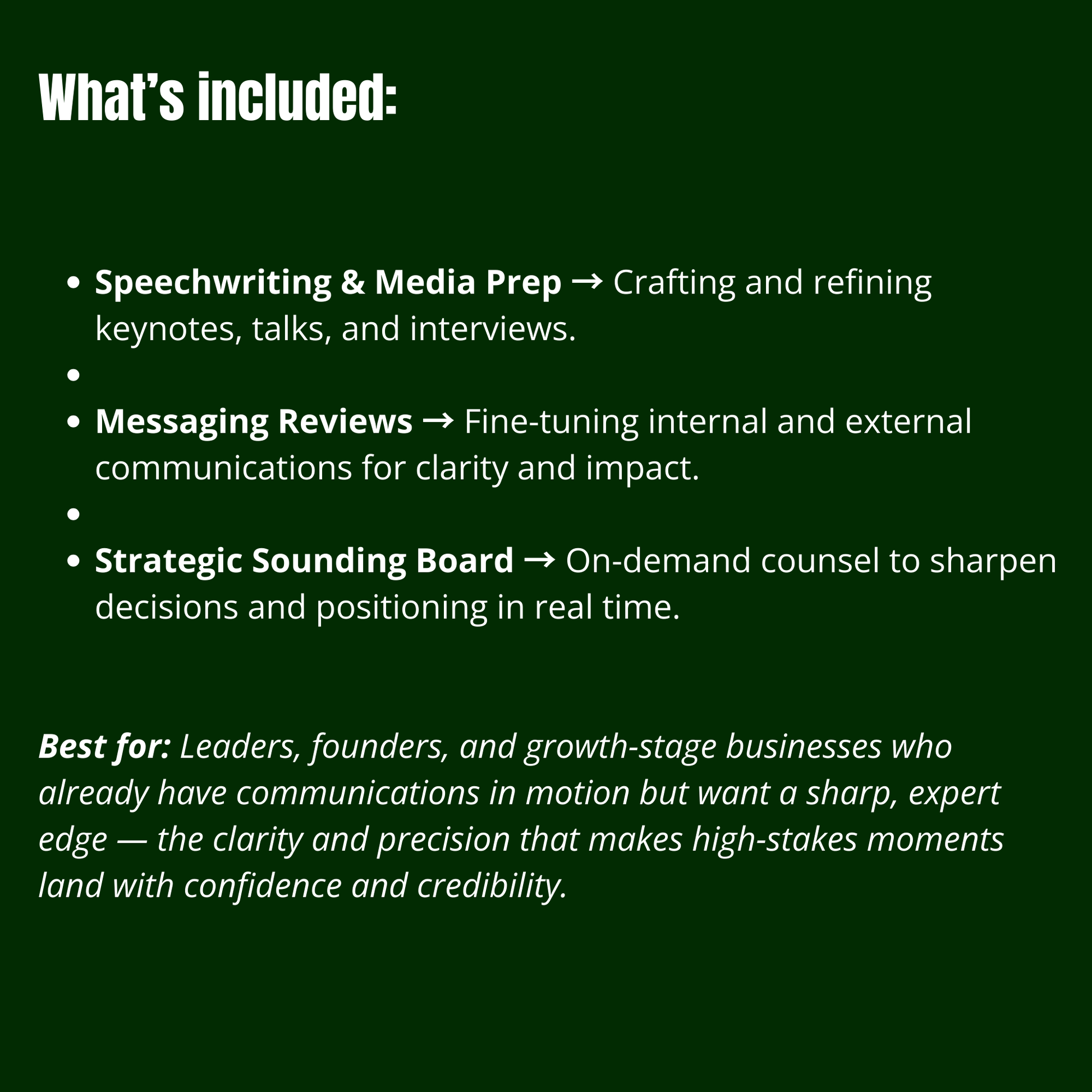 C-suite leaders, founders, and growing businesses who already have communications in motion but want the added edge that makes their message credible, confident, and impossible to ignore.